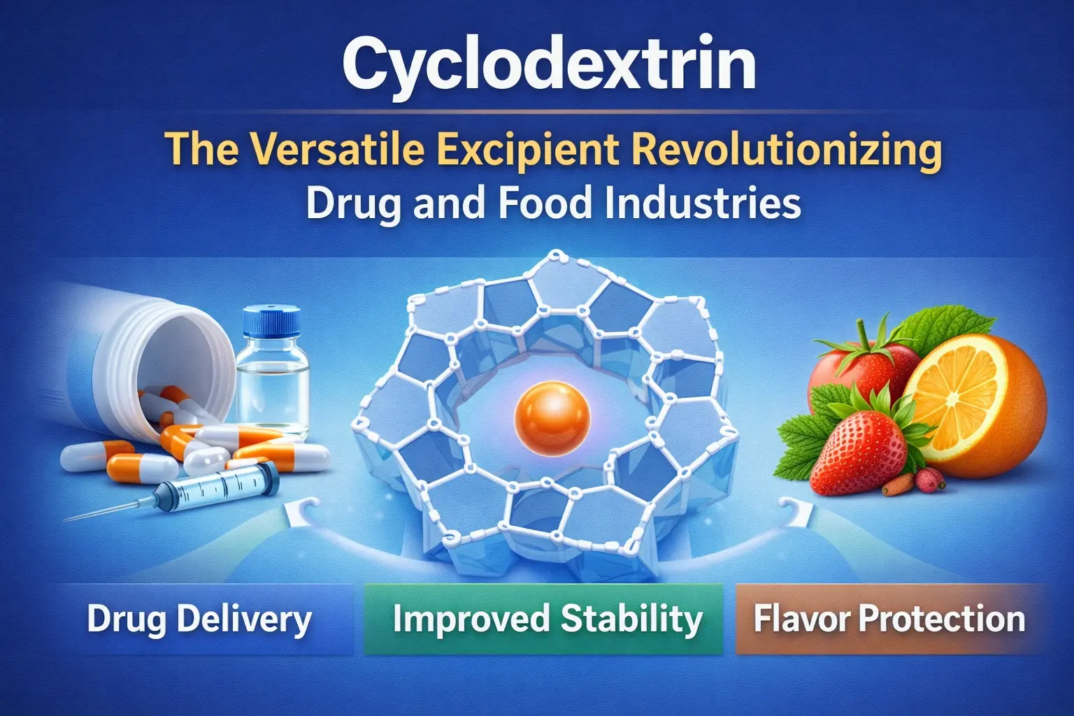 Oppdagelsen av cyklodekstrin er et av de viktigste skritt fremover i historien til mat og medisin. Dette naturlig forekommende sykliske oligosakkaridet har endret måten vi leverer medisiner på, holder maten fersk og bruker mange andre kjemikalier i industrien. Produktet lager inklusjonskomplekser som adresserer viktige problemer på mange felt takket være dens særegne molekylære struktur, som har et hydrofobt indre hulrom og en hydrofil ytre overflate. Dette fleksible hjelpestoffet endrer formuleringsvitenskap og produksjonsprosesser over hele verden. Det kan gjøre alt fra å forbedre stoffabsorpsjonen til å skjule dårlig smak i medisiner.