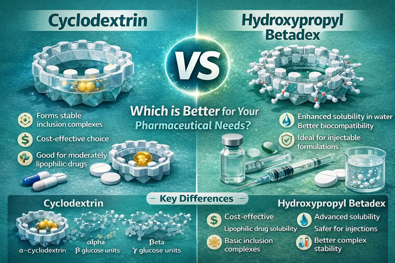 Når det gjelder farmasøytisk bruk, cyklodekstrin oghydroksypropylbetadexer begge gode for medisinleveringsmetoder på hver sin måte. Standard cyklodekstriner er gode til å omslutte molekyler og er kostnadseffektive. På den annen side er hydroksypropylbetadex bedre til å løse seg opp i vann og er mer biokompatibel. Valget avhenger av behovene til formuleringen din, med hydroksypropylbetadex som gir avansert løselighetsforbedring for vanskelige legemiddelmolekyler og syklodekstriner som utmerker seg i grunnleggende inklusjonskomplekser.