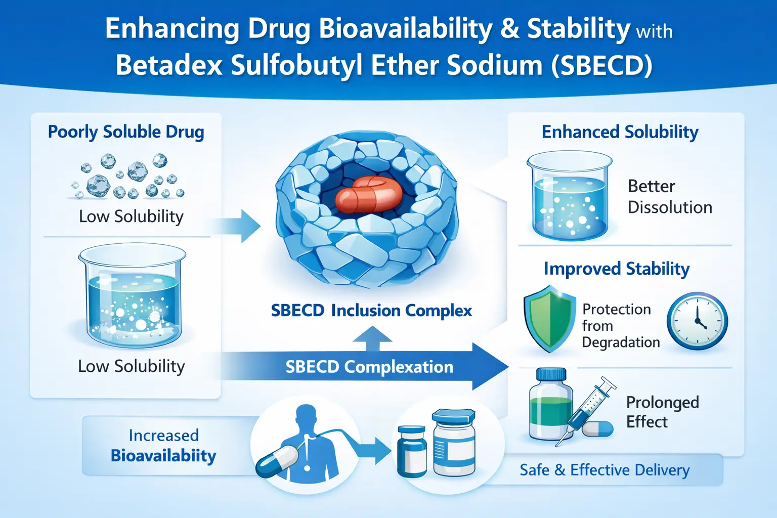 Betadex Sulfobutyl Ether Sodium (SBECD) endrer måten medisiner lages på ved å kombineres med medisiner som ikke løser seg godt. Dette cyklodekstrinderivatet forbedrer biotilgjengeligheten ved å omslutte molekyler, noe som gjør at noen kjemikalier løses opp til 1000 ganger bedre i vann. Økningen i stabilitet skjer fordi SBECD hindrer legemiddelmolekyler fra å brytes ned samtidig som behandlingens effektivitet opprettholdes. Som et FDA-godkjent hjelpestoff gjør SBECD det mulig å administrere medisiner gjennom munnen, noe som ikke var mulig før. Dette gjelder spesielt for soppdrepende, antivirale og onkologiske legemidler.